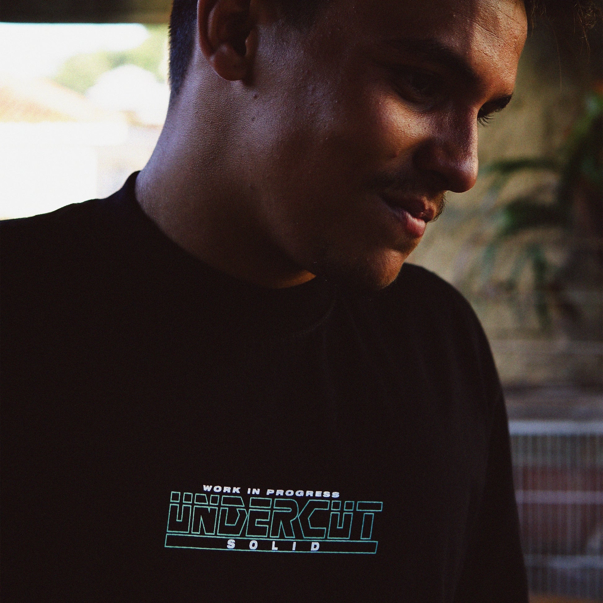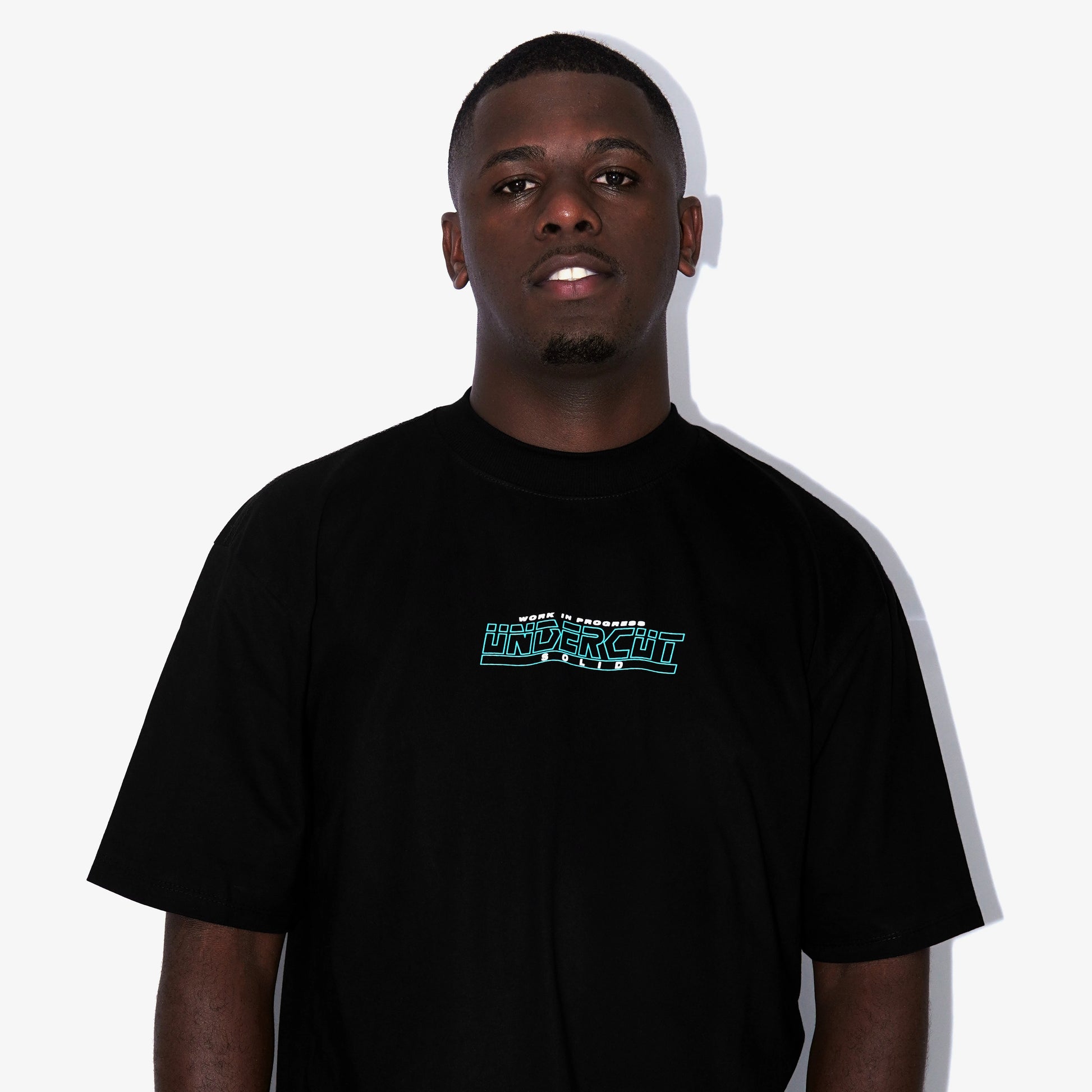 A camiseta possui modelagem highline, com um corte padrão e gola de 3,5 cm. Feita de malha 100% algodão premium de peso médio de 175 GSM na cor preta. Possui estampa serigrafada na frente.